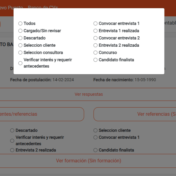 Visualiza los candidatos desde cualquier dispositivo (PC, tablet o celular) y lugar con conexión a Internet y clasifícalos. Podrás contactar a los candidatos directamente desde la plataforma, entrevistarlos y guardar su perfil para futuras búsquedas en tu propio banco de CVs. Además podrás hacer el seguimiento del proceso junto a tu cliente.